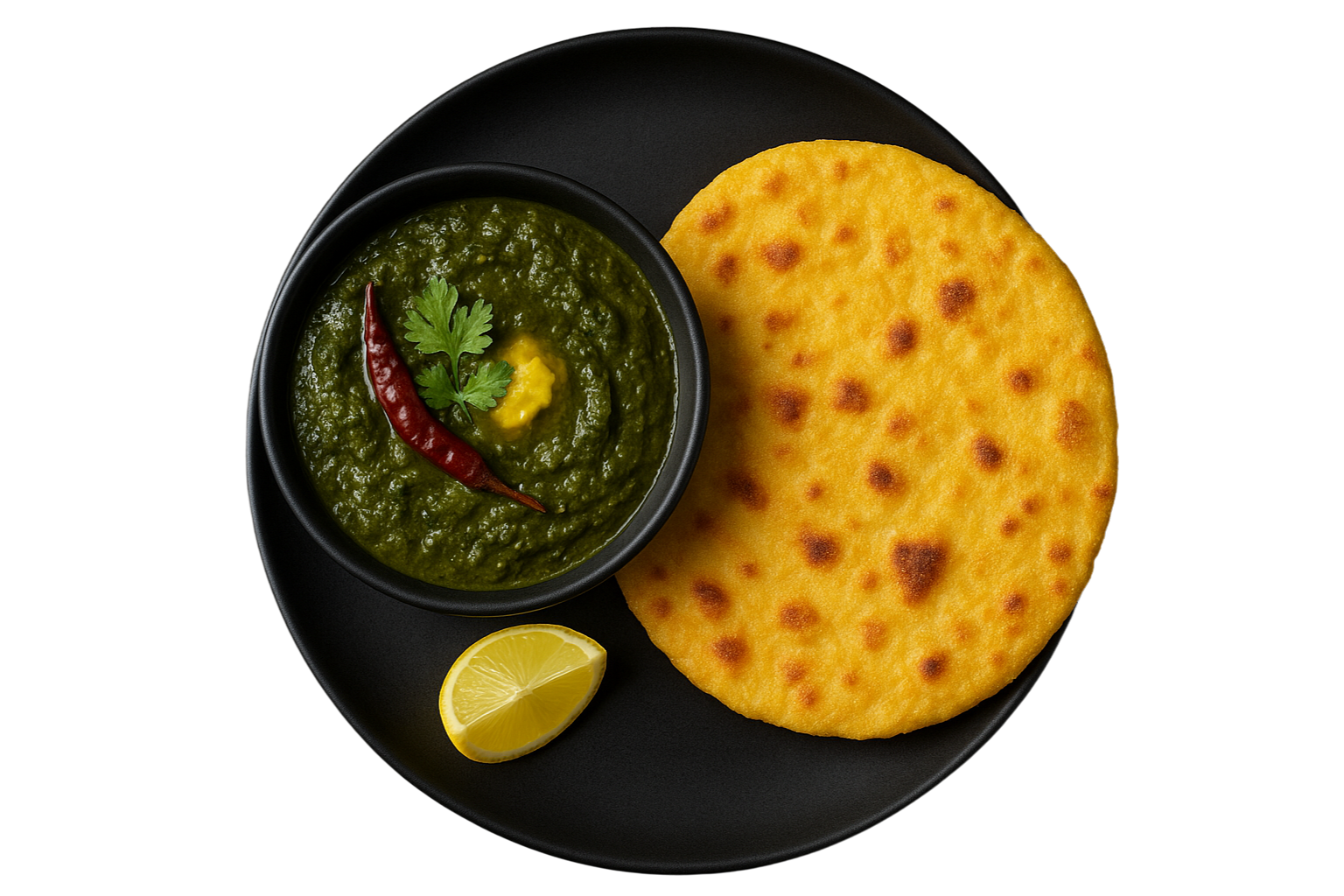 Mustard greens with desi tomato tadka, served with makki ki roti & butter.