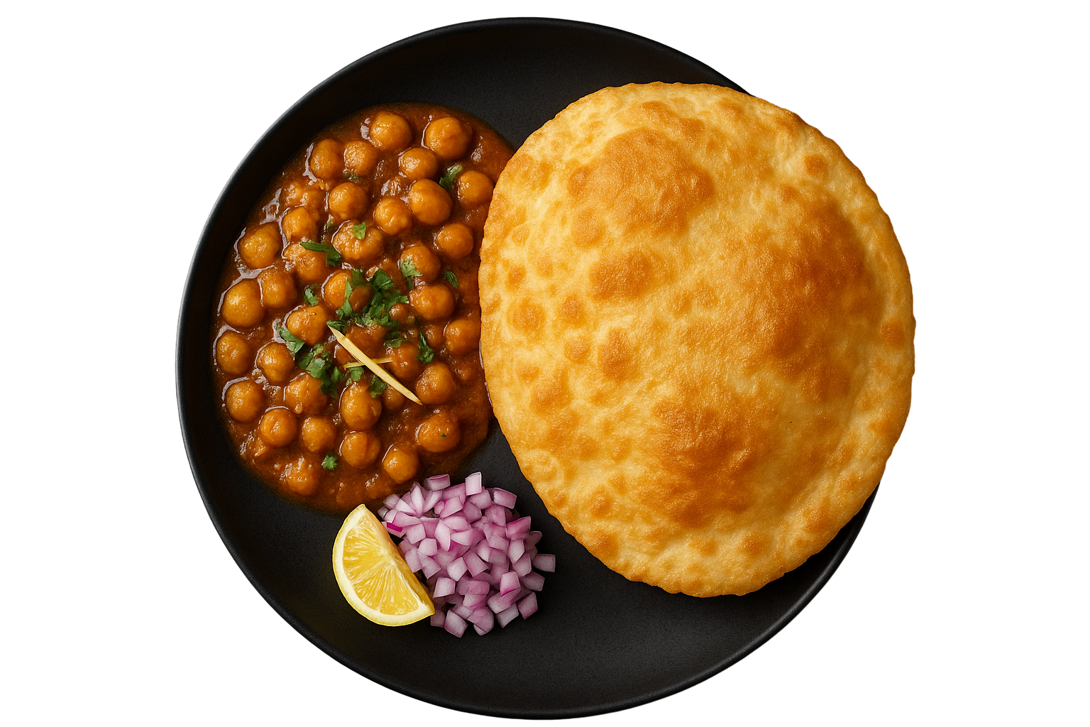 Spicy chickpeas with fluffy fried bhature, served with pickle & onion salad.